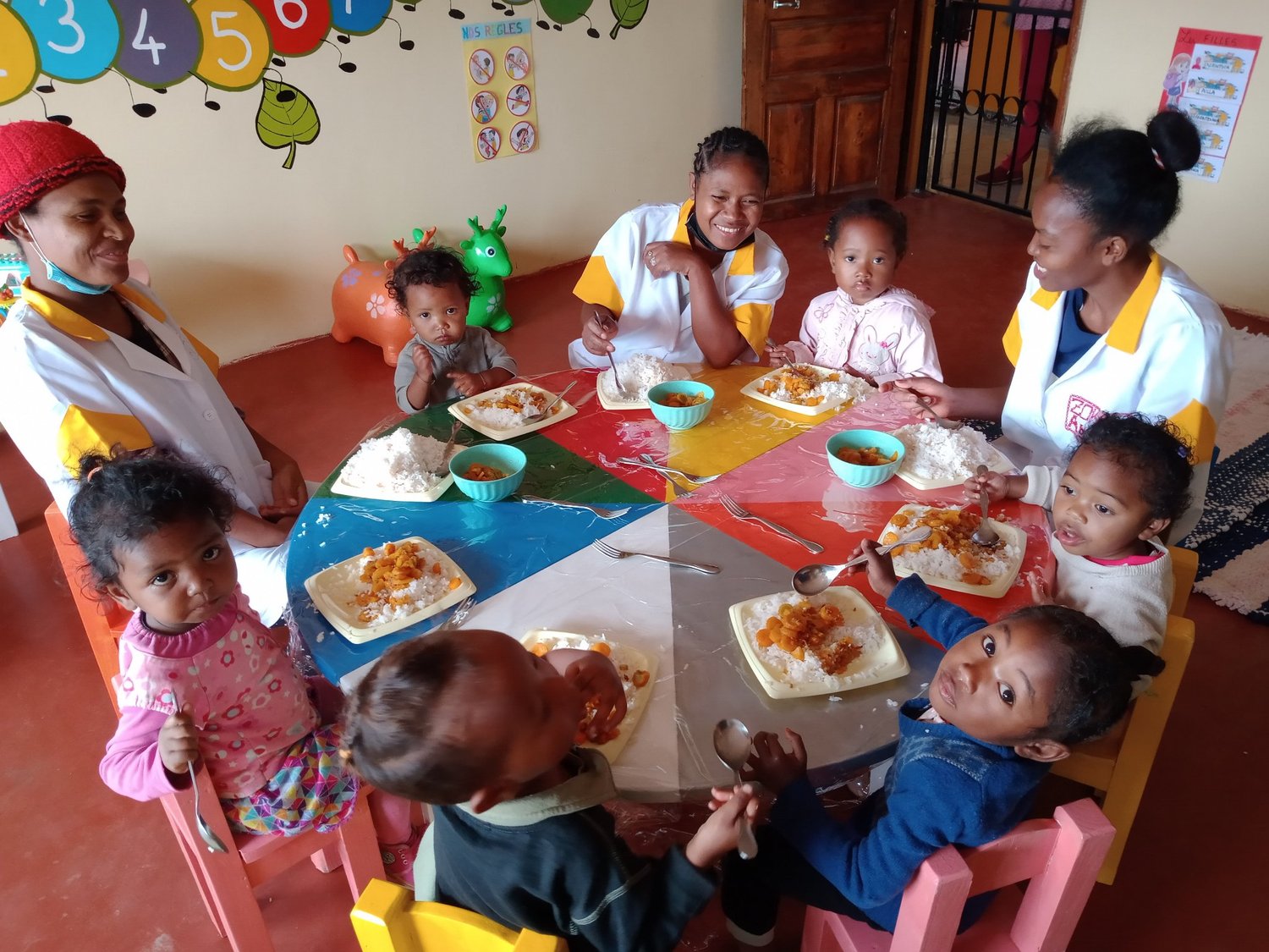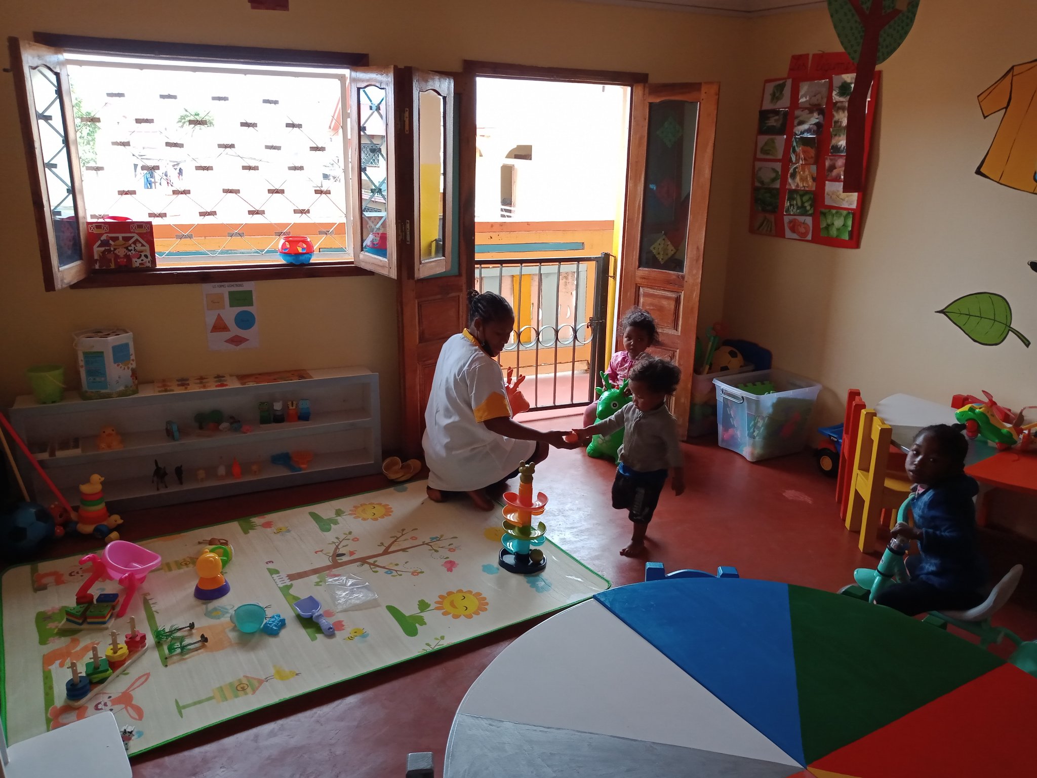 La crèche accueille gratuitement une quinzaine d’enfants de 1 à 5 ans issus des quartiers vulnérables d’Antananarivo et forme également 3 jeunes femmes à l’encadrement des jeunes enfants nommées « Nounous » pour qu’elles soient qualifiées et puissent ensuite travailler en crèche à Madagascar.